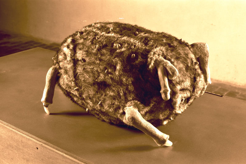 Carmen Mörsch announces on a note attached to the church door that „the 4 whose fault everything is" have finally been captured and beaten to death and now everything is all right again. As proof of this victory the corpses of the monsters who were responsible for all the world's evils are laid out (or staked out) on four large, coffin-like chests in the nave of the church. These creatures, formed from plastic, plaster, textiles and latex, still bear the evidence of the way they died (they have stab wounds, have been shot, torn to pieces or squashed flat). On the one hand, they cause horror and pity, but on the other hand they remind us of cute toys or distantly even of comic figures and are somehow amusing. Their character is anyway thoroughly hybrid. One of them seems to be a cross between a squid and a rat, another is half male and half female, and a third could, at first glance, be either a squashed toad or a simply a pile of industrial waste. Each of the four monsters is a visualisation of a certain group of evils, and together they are the personification of absolute wickedness – with reference, in a way, to the four elements of life. Since the evils are named on plastic signs attached to the trunks these vivid objects function symbolically, to a certain extent, as voodoo dolls, while, as actual monsters they are real scapegoats. And as a secondary effect, this also emphasises the difference between a painted version and a carved version of Christ on the Cross, for example.