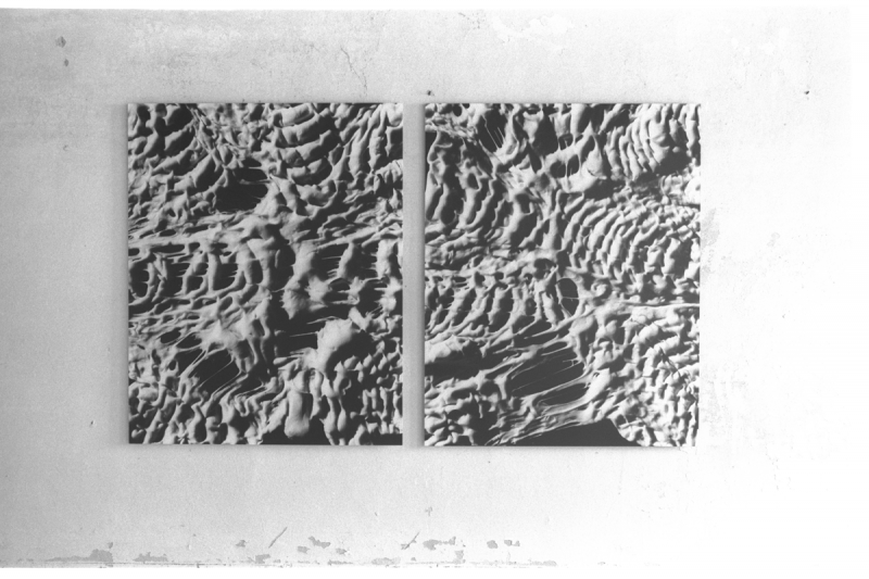 The work "Anlage als Läufer" (* using the multiple meanings of Anlage - facility, complex, investment - and Läufer - throw rug, runner, bishop chess figure) deals with a particularly plastic form of medial indifference. While the series of photographs pretends to precisely show the structural surfaces of an unknown geological formation, and the panorama - the repetition of the conclusive causal relationship - still provides an overview, the explanation that the images are actually macro shots of store-bought chewing gum reveals the critical invariable. The result of a seemingly endless and only rhetorical rumination, this echo of the Pavlovian reflex accompanies us as a classy yes-no relief. Presumably, similar forms have been already presented in the form of lectures in the culture hall (* the exhibition site at Cluster Images), but only in this panorama by Kathi Müller -B- is their tectonic relationship to the world traced silently. This musical score is set in stone. Marion Kreißler, Martin Conrath