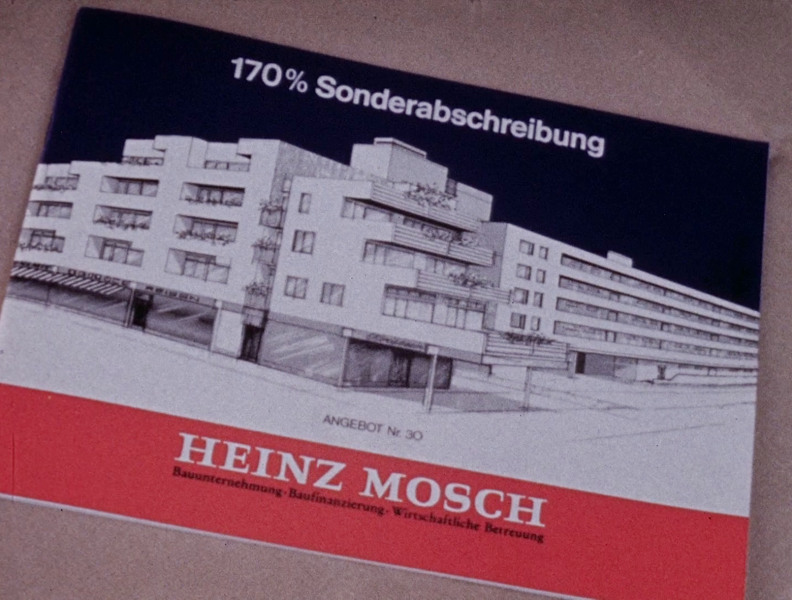 Bauen in Berlin is a commercial film made by the advertising agency Zühlke + Scholz for Heinz Mosch GmbH & Co. KG, which was one of the largest West German construction companies and a major player in the building of subsidized apartments in West Berlin. The film’s subtitle patently exposes the financing model of publicly funded apartment construction as a private investment scheme: ... spart Steuern – bringt Geld (“lower your taxes – make money”). One secondary effect of the system: the higher the building costs, the more that could be written-off, which means greater tax savings and more profit. As a result building costs in West Berlin in the 1970s and 80s reached absurd dimensions, which weighed heavily on the budget of the divided city and dramatically increased its long-term debt.