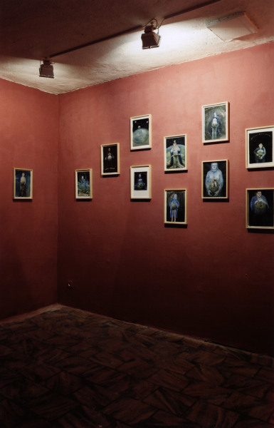 The "Kabinett der neuen Abteilungsleiterin” (Cabinet of the new head of the department”) by Frauke Gerhard in the back lounge of the youth club was an almost museal set-up, designed to create intimacy and a dense athmosphere for a personal encounter with her works. On a wall dyed with dark red pigment there was a series of paintings of the female ‘blue-collar’ head of the department, taken within a timespan of nearly 10 years. Reminiscent of icon painting and breviary illustrations, they are depictions of Gerhard’s alter ego: the blue work overall replaces the cloak of the Madonna. The images link up with performances and other projects by Gerhard, in which the necessities of daily life as an artist and as a mother are presented as deeply and consciously interrelated. Among other projects, Frauke Gerhard took on the responsibility of caring for a neglected playground in her immediate Cologne neighbourhood and initiated a "communal, cross-generational art and communication practice’—based project: COMTAINER STATION. The playground in combination with two containers set up by her, served as studio and toolsheds, garden and meeting-place. By actively involving the neighbourhood she initiated exhibitions, planting and other gardening activities and created informal opportunuties for conversations and exchanges. In the Cabinet, her self portraits as a mother, the continously transforming rendering of her big belly representing pregnancy, the globe, a garden, reflect these experiences in a very personal and provocatively spiritual language of imagery, of femininity, motherhood and connection to the Earth.