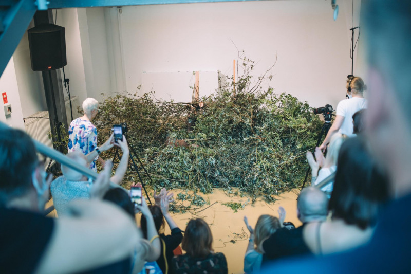 In Tomasz Domański's latest performance a tree belonging to cultural symbols of life and knowledge will appear again, connecting the world of man and nature. The title Cutting describes the action performed and the punishment and spectacle that accompanies its infliction. Cutting will be another return to the motif of man-tree, ever present in Tomasz Domański's works. It began with a find from 2007— a piece of tree, empty on the inside, covered with bark, bringing to mind an organic shell abandoned by a powerful animal. When the artist put it on, it became his shelter, his solitude, but also his armor and a vehicle for transformation: "Physically and mentally I almost became a tree. I wandered with the hollowed out trunk on my back imagining various projections; I experienced the weight of the cross, the loneliness of Don Quixote, and even participated in personal tree therapy as I walked the streets and fields embraced by the tree. My dead trunk provided me with a super natural feeling of belonging to the ecosystem [...]." - he wrote about the experience. It resulted in the video work “I Am More Tree Than a Person”, two parts of which were made in 2008. These are recordings showing Domański wandering like a hermit crab through natural and urbanized landscapes. In 2010, both video parts were included in the installation "The Return of the Man Called a Tree", where they were seen by the audience next to swaying trunks moving like pendulums. In this installation, touch, movement, and the poignant sound of wooden blocks being pushed by hands build an unsettling experience for the participants. These works are far from didactic, infused with the environmental concerns of an unwitting participant in the Anthropocene.