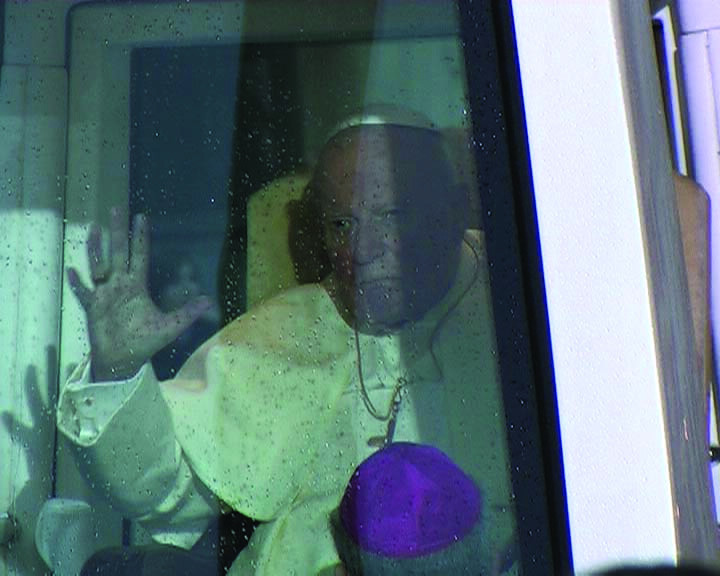 Pope John Paul II, who died last year, became known as the first media pope. He used the public stage of the media with so much savvy to communicate the message of the Catholic Church that he himself became an icon of the media world. His omnipresence in public produced a simultaneity of emphatic experience for all believers. In their most recent work, Für ein Leben nach dem Tod (For a Life after Death, 2006), the artist duo Korpys/Löffler accompanied the pope with a camera at all public appearances in Rome during the last year of his life. During their stay at Villa Massimo, they had themselves accredited as journalists in order to follow the official events of the Roman Catholic Church from the places reserved for reporters. Among CNN, BBC, and France2, the artists filmed the material for their seventy-five minute film.