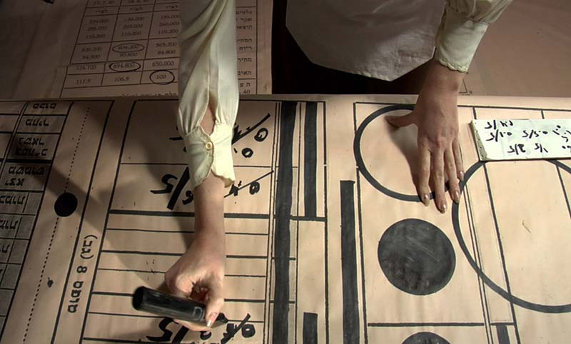 Mother Economy is a meditation on Holocaust remembrance and loss. In Zack’s video, a frugal, industrious woman locates objects belonging to absent family members and proceeds to inventory, catalogue, and assign them numerical values. Using the data in equations and formulas, she meticulously transforms kugel (noodle pudding) into an economic pie chart. With reports of World War II broadcast over the radio, the lonely protagonist maintains order and composure through domestic rituals. Sketched portraits of relatives, as well as personal artefacts traced on paper, serve as memorials to the dead.