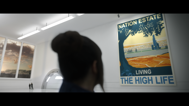 With a glossy mixture of computer generated imagery, live actors and an arabesque electronica soundtrack, Nation Estate explores a vertical solution to Palestinian statehood. One colossal skyscraper housing the entire Palestinian population – now finally living the high life. Each city has its own floor: Jerusalem on the third floor, Ramallah on the fourth floor, Sansour’s native Bethlehem on the fifth and so on. Intercity trips previously marred by checkpoints are now made by elevator. Aiming for a sense of belonging, the lobby of each floor reenacts iconic squares and landmarks.