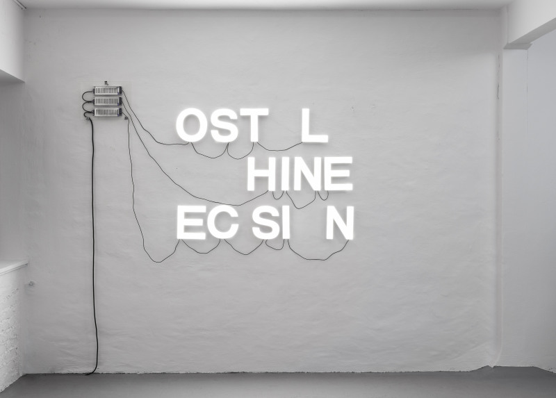14 of 21 LED illuminated letters, 14 of 21 cardboard boxes addressed and posted to two exhibition spaces, trafos and cables, chrome-plated pipes, hangers, tv screen with tracking web site, full screen, 16:9