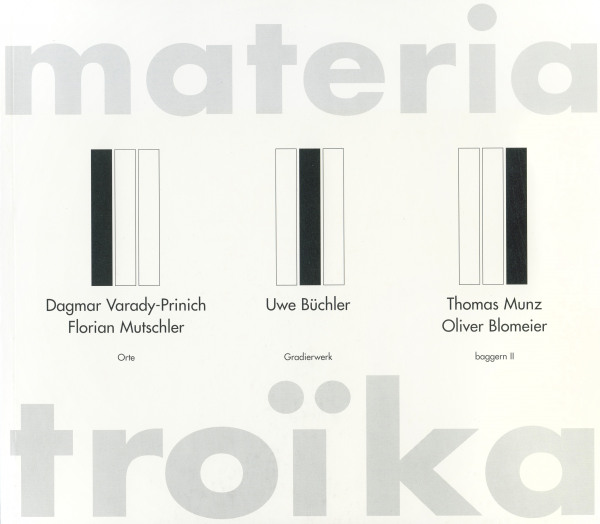 materia troïka 1995: Gradierte Information – dekonzentrierte ZeitArtists: Uwe Büchler, Dagmar Varady-Prinich, Thomas Munz & Oliver Blomeier With texts by Martin Conrath, Günther Kowa |