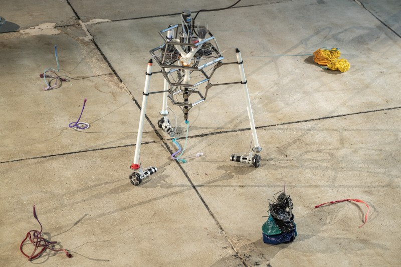 It moves autonomously and makes creative decisions based on its sensor data. In a storage bubble, it carries around granules made of plastic waste. The objects created during an exhibition can be shredded and serve once again as raw material, resulting in an almost closed cycle. The robot plays our role as earthly actors and offers the possibility for critical self-examination. Viewers can watch solid plastic material being melted and transformed into works of art – the technical process of plastic recycling is revealed. Through this aesthetic experience, the relationship with the material is to be changed and public discourse on plastics encouraged.