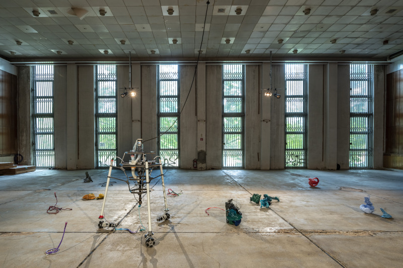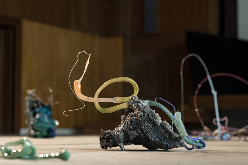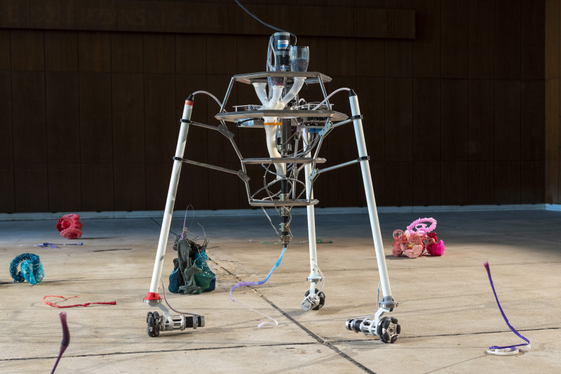 An extruder built into a robot transforms plastic granules into anamorphic objects, which have a plump, glossy surface right from their birth. As the material swells out of the robots' organs, it curls and warps until it cools and hardens in its final shape. The robot spreads these artificial pieces around the exhibition space like virtual brushstrokes.