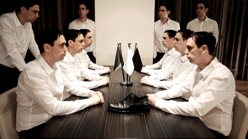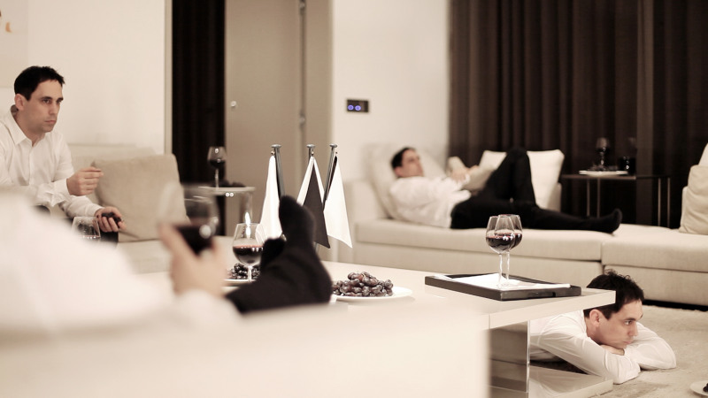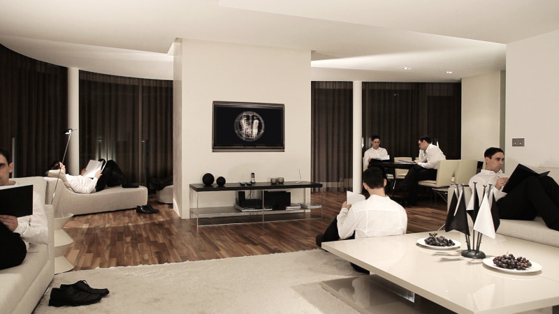 In the video installation TEN (2010), Niklas Goldbach stages a summit of today's rulers in the penthousesuite of a luxury hotel in Berlin, in which he creates a tenfold image of himself as only actor. The film seems to have come out of a laboratory, from a mysterious, undiscovered time where future and present have merged. All individual aspects are removed, everything is subjected to the protocol of efficiency and the mute poker of power under the mask of equality.