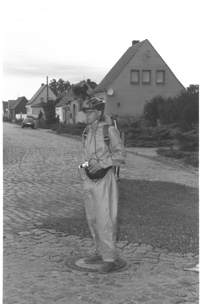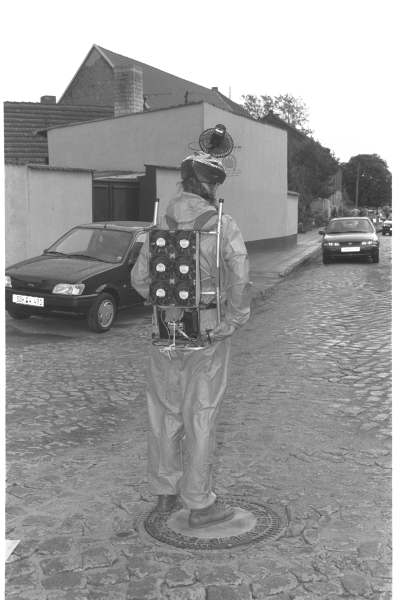 An zwei Tagen soll der Ortskern von Werkleitz zu je drei Std. erfrischt/belebt werden. Am 1. Tag wird als starre Skulptur, aber mit aktivem Luftwirbelaggregat (bestehend aus einer Helmeinheit mit einem Ventilator und einer Rückeneinheit mit sechs Ventilatoren), an fünf Positionen/Standorten agiert. Am 2. Tag werde ich als bewegte/mobile Skulptur auf das Publikum zugehen und versuchen, es zu bewinden und mit ihnen zu kommunizieren. Informationen und Fragebögen zur Kunstaktion werden direkt an das Publikum per Handzettel gegeben. Wie reagiert ein Publikum, wenn es mit ungekannten Situationen und mit Fremdem konfrontiert wird?! Bereiche wie Ökologie, Gesundheitswesen, Klima, Arbeitsmarktpolitik und Kommunikation werden durch diese "Eingreifmassnahme" aktiviert.