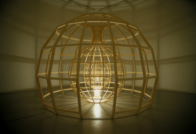 Unser innerer Kampf, uns sinnvoll mit der Welt um uns herum auseinanderzusetzen und Spuren zu hinterlassen, wie er in Tsuis Arbeit zu sehen ist, kommt von dem schwierigen Verhältnis mit unserem eigenen, wahren Selbst, oder dem reinsten Kern unseres Seins, der für die meisten Menschen, mit denen wir in Verbindung treten oder umgehen, weitgehend unsichtbar und unübersetzbar bleibt. Goh Idetas überwältigend erhabene Struktur insideout ist eine Darstellung dieser dichotomen Beziehung zwischen dem, von dem wir wissen, dass es die reinste Selbstwahrnehmung ist, und dem, was auf uns projiziert wird, auf eine Art auf uns geschichtet wird, die einen oberflächlichen aber lesbaren Eindruck unseres individuellen Ichs konstruiert. Die Schönheit von Idetas akribischer Holzkonstruktion liegt in ihrer Transparenz, in der klaren Ansicht des Kerns, von dem Licht ausstrahlt und einen Schatten auf die Wände des Raums wirft und so eine weitere Schicht bildet, die wir sehen, aber auch durchdringen können. In dem Moment, in dem wir Idetas Installation erleben, wenn wir die Stärke des Inneren sehen und uns die Zerbrechlichkeit und Komplexität der äußeren Schichten eingestehen, die dieses Innere normalerweise verdecken würden, erfahren wir einen stillen Trost.