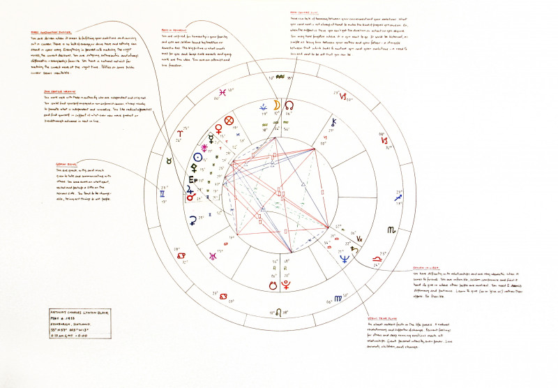 Grayson präsentiert eine sonderbare Sammlung astrologischer Geburtshoroskope von weltpolitischen Figuren, die im Irak-Krieg und dem "Krieg gegen den Terror“ involviert sind, wie Condoleezza Rice, George W. Bush, Tony Blair, Saddam Hussein und Osama bin Laden. Die von Grayson in akribischer Feinarbeit gezeichneten Gestirnskonstellationen basieren auf computergeneriertem und daher vorprogrammiertem Material aus dem Internet. Das Computerprogramm kombiniert und arrangiert entsprechend den Positionen der Planeten vorbereitete Textbausteine. Das Resultat soll eine "Kartographie“ der innersten Motivationen und psychischen Potenziale einer Person darstellen, aus denen Sätze zu lesen sind, wie: "Your enthusiasm is so strong it can sometimes be a little too much making others uncomfortable.“