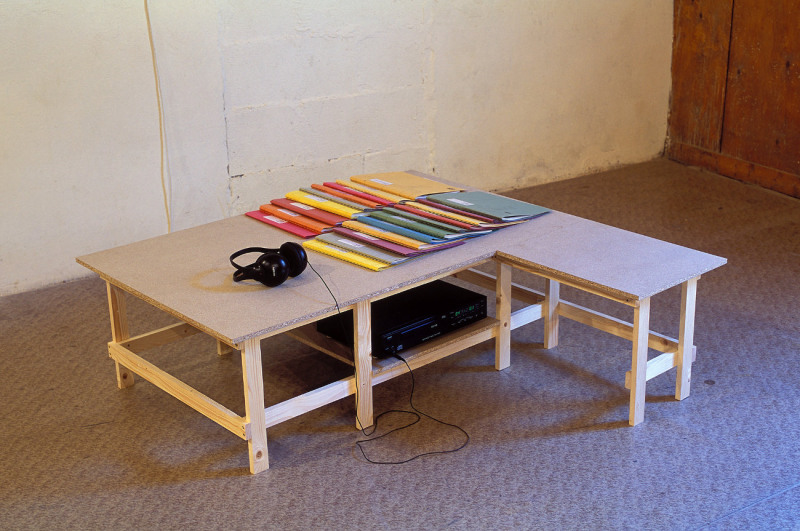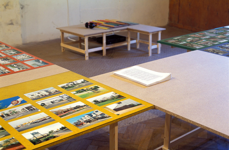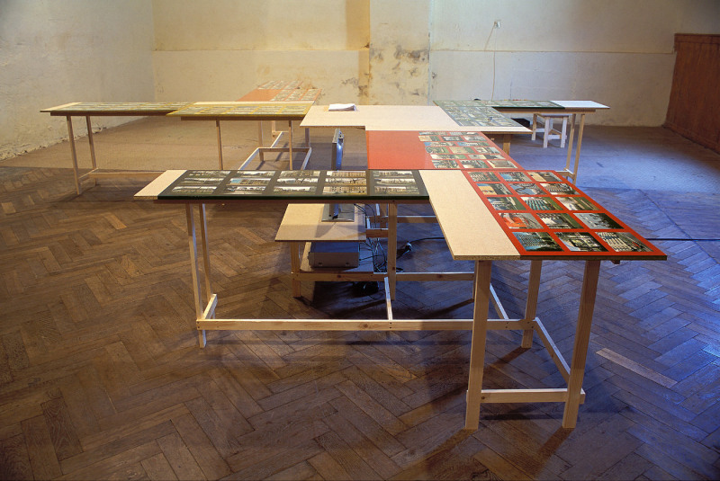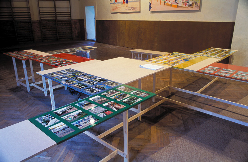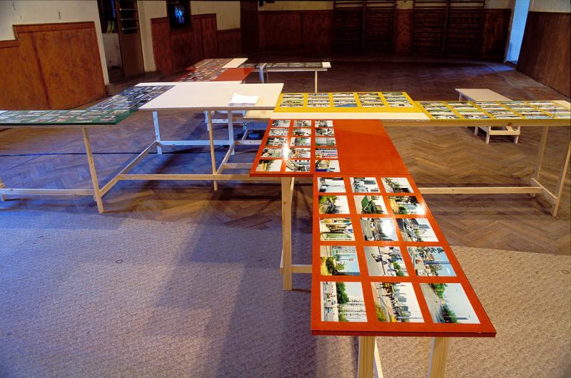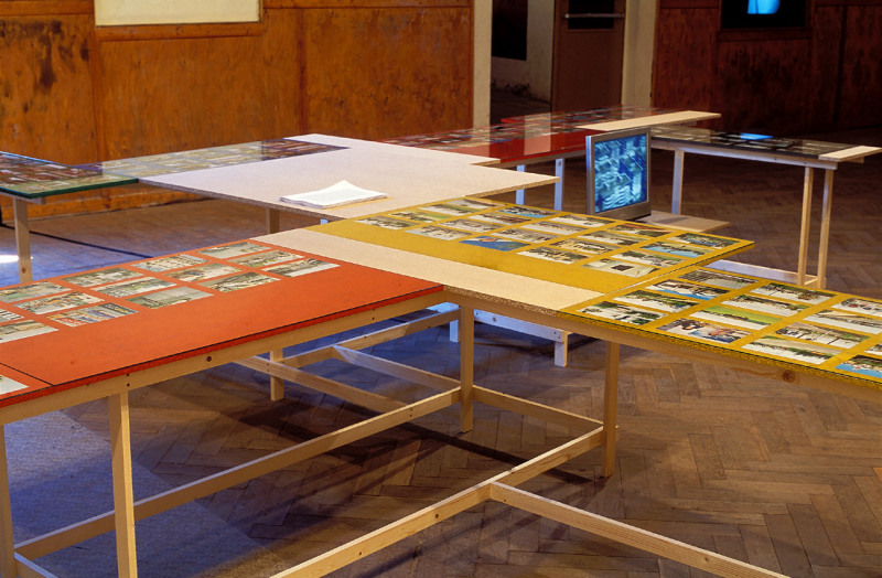 Wiebke Grösch & Frank Metzger, Installation aus Fotografien, Archivmaterial, Displayelementen und Videoarbeit, 2000-2002. Ausstellungsort: Sporthalle Werkleitz.