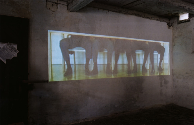 Aernout Miks Kombinationen aus Architektur und eingelassenen projizierten Videobildern lösen Verwunderung aus, durch unsere Schwierigkeit, uns zu orientieren und die Tätigkeit der Menschen, die er zeigt, einzuordnen. Das Handeln ist widersprüchlich, wie in der Videoarbeit "Garage", in der eine Gruppe von Personen schweigend und scheinbar einträchtig beieinander steht. Sie trinken, spucken das Getrunkene zurück ins Glas, um dann in überraschenden Aktionismus zu verfallen und einen aus der Gruppe herauszustoßen. Das statische Bild der Kamera wirft die Frage nach einem möglichen Aktionsradius des Einzelnen auf und nach unserem durch das Medium begrenzten Blickfeld, welches es uns unmöglich macht, die Situation, ihre Spielregeln und ihre räumliche Beschaffenheit zu erfassen (13).
